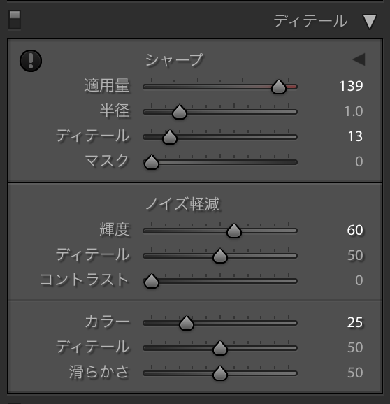 車のボディの艶がでるように「シャープ」「ノイズ軽減」を強めに設定。